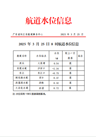 广东省珠江东航道事务中心2025年3月25日航道水位信息
